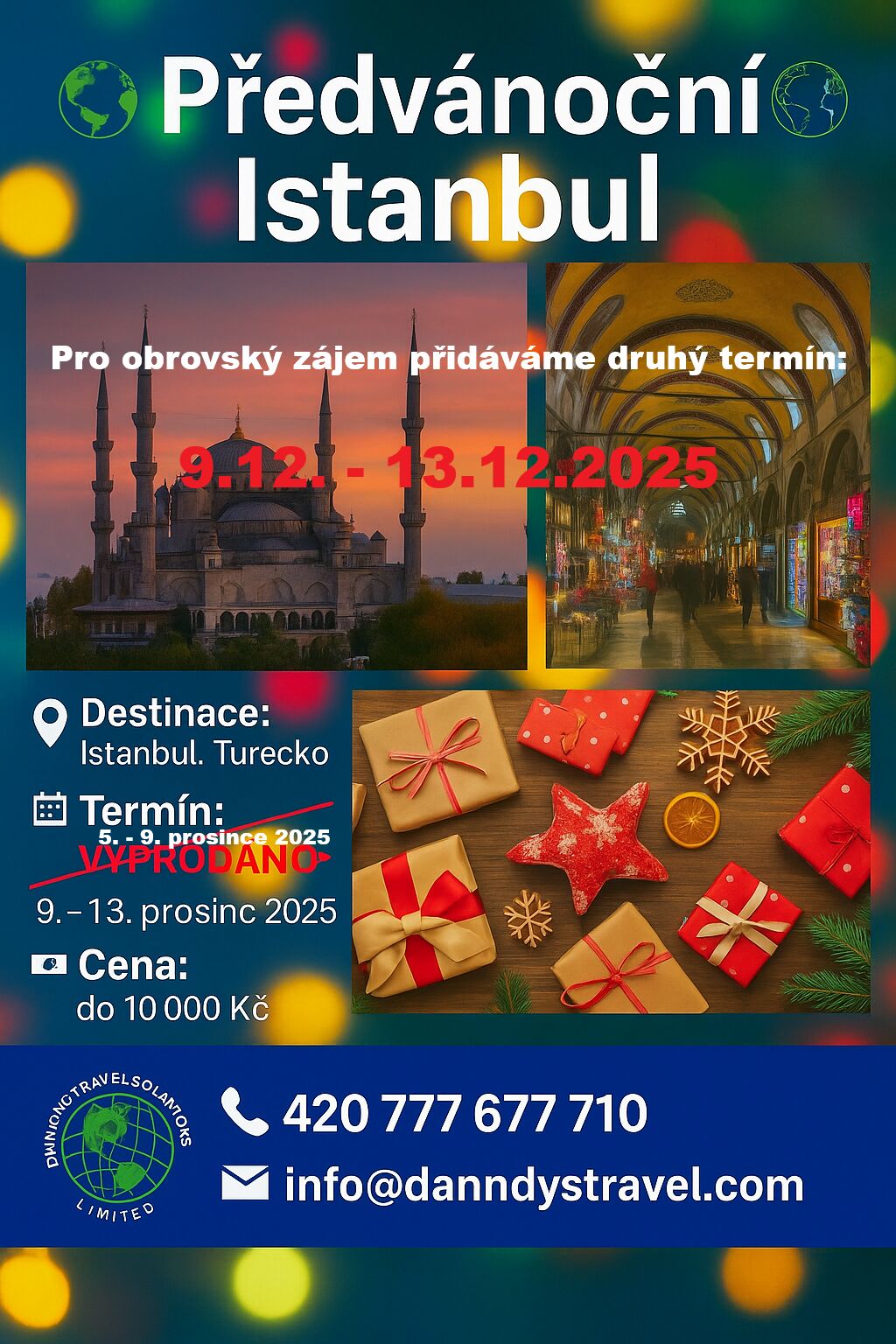Zájem o tuto cestu do Istanbulu překonal všechna očekávání a první termín (5.–9. prosince 2025) je již zcela vyprodán. Abychom vyhověli dalším zájemcům, přidáváme nový termín 9.–13. prosince 2025 – se stejným programem, službami i cenou. Pokud jste se tedy do prvního termínu nestihli přihlásit, máte nyní druhou šanci zažít předvánoční Istanbul naplno.